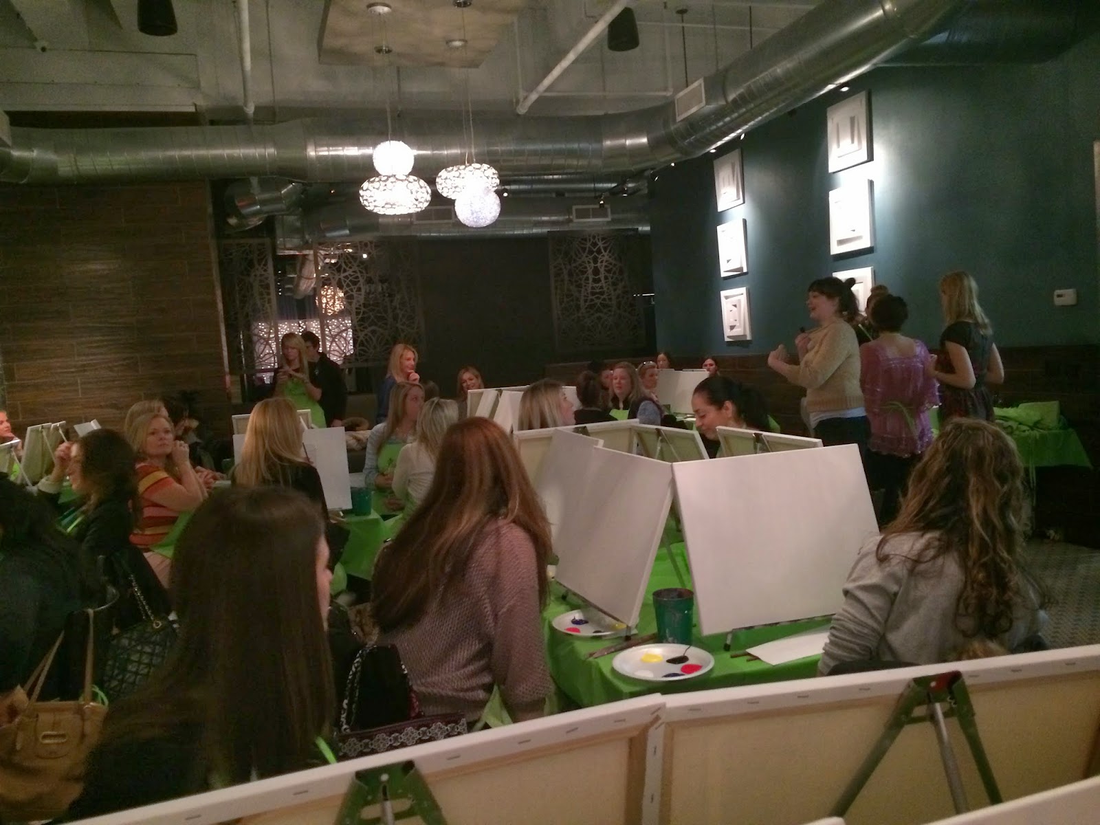 Recently, Revel on Franklin Ave hosted a ladies night painting party. $65 bought you drinks, hors d’oeuvres, paints and brushes, an easel, canvas and most importantly (for me anyway)- the instruction of the art teachers from PaintNite.- where the motto is to “drink creatively.”