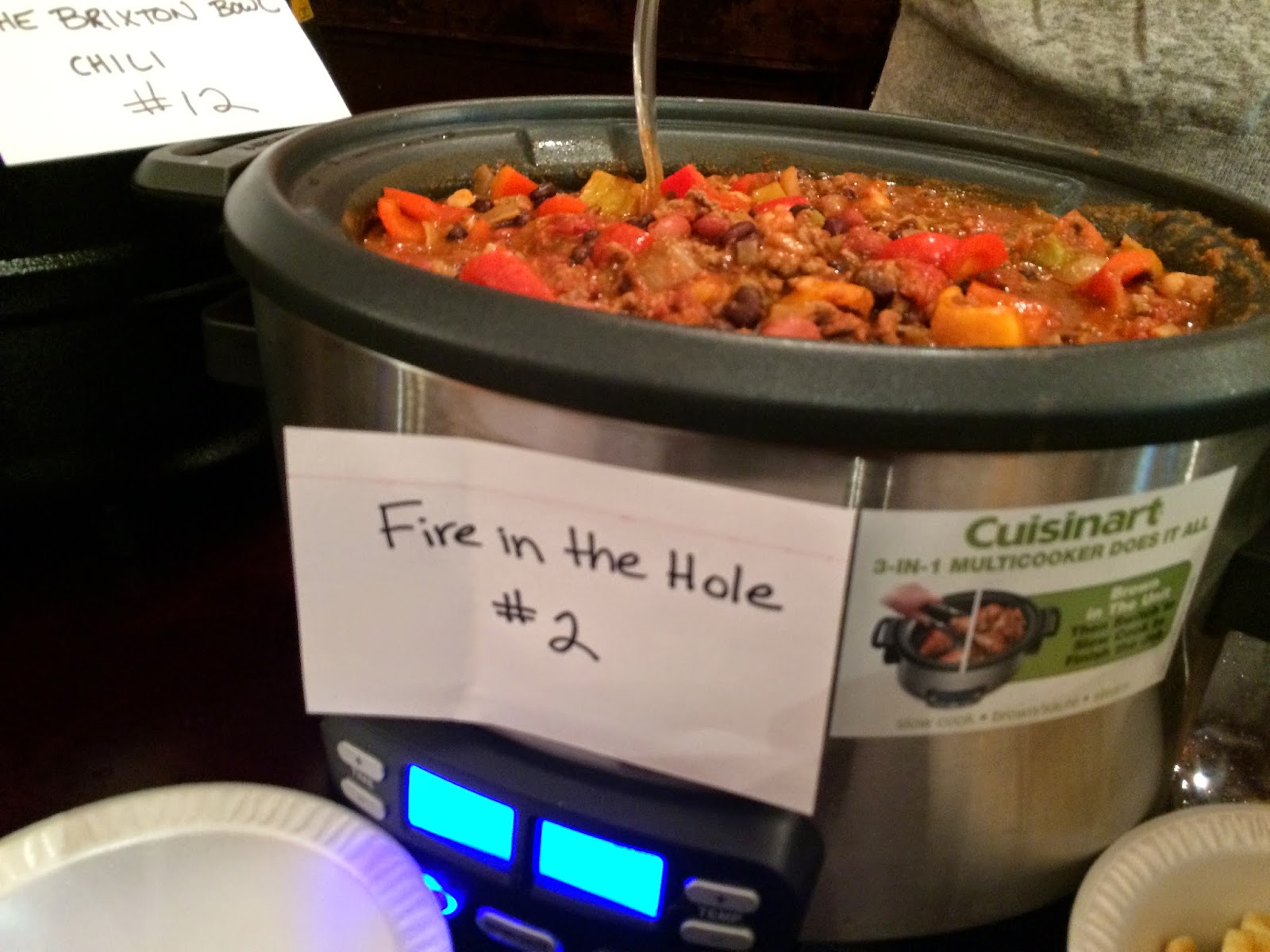 Amongst the chili tasting, beer and wine were flowing and tasters were tasting. Each taster received a score sheet and went to work. With the tasters as judges, everyone was required to taste and score each chili. It was a tough call- most of the entrants scored equally well on presentation and aroma. The difference came down to taste and texture. After much tasting, re-tasting, scoring, and TUMS- popping, the results were in. Drum roll please…
