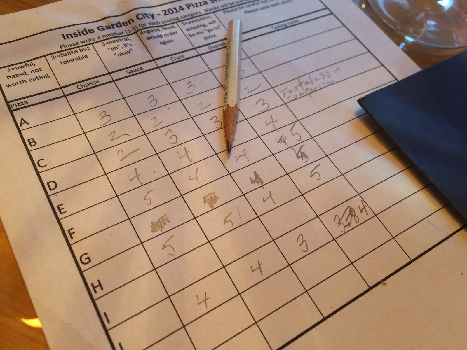 Before the day of the Pizza Showdown arrived, judges were educated on the scoring system and its categories (crust, sauce, cheese and overall). They were also provided with rules such as- Each pizza must be tasted at least once and labeled toothpicks must not be removed to avoid confusing the pizzas. Lastly, the judges were advised to be decisive and consistent, keep scores private, and most importantly- arrive hungry but not ravenous so as not to confuse really liking something with being overly hungry.