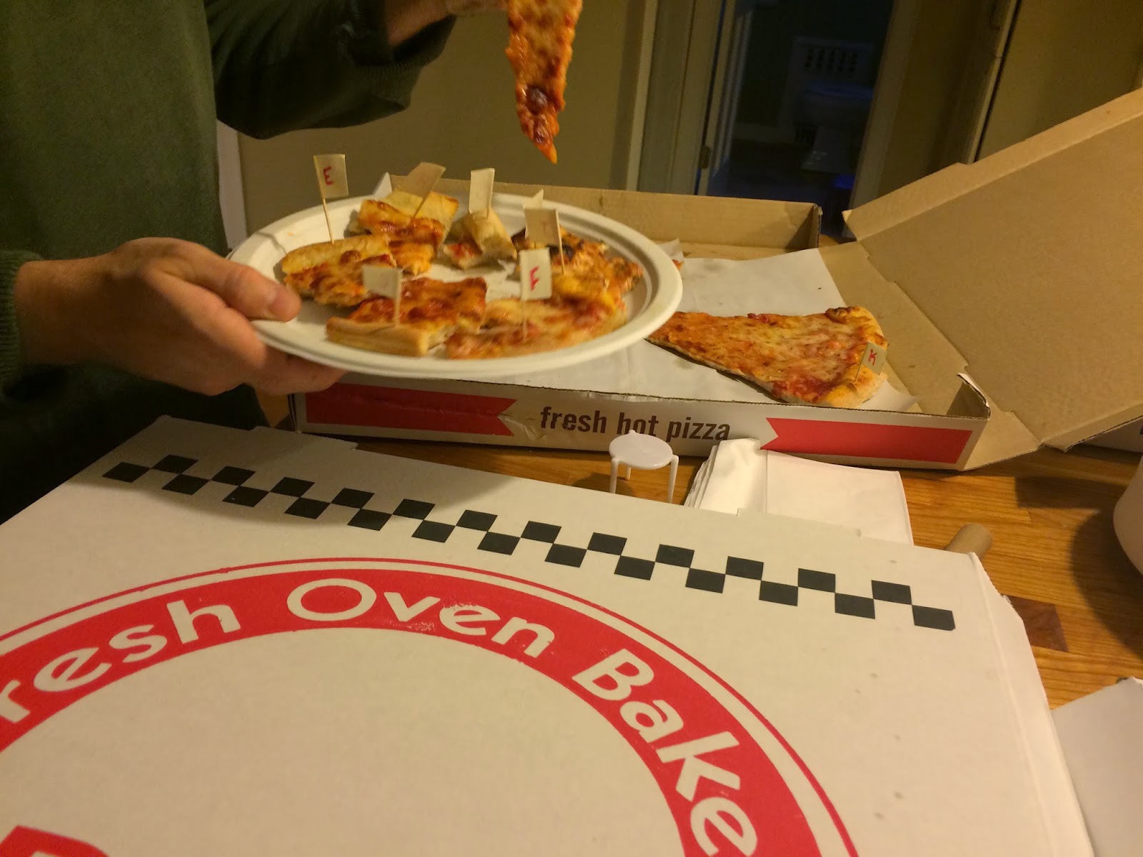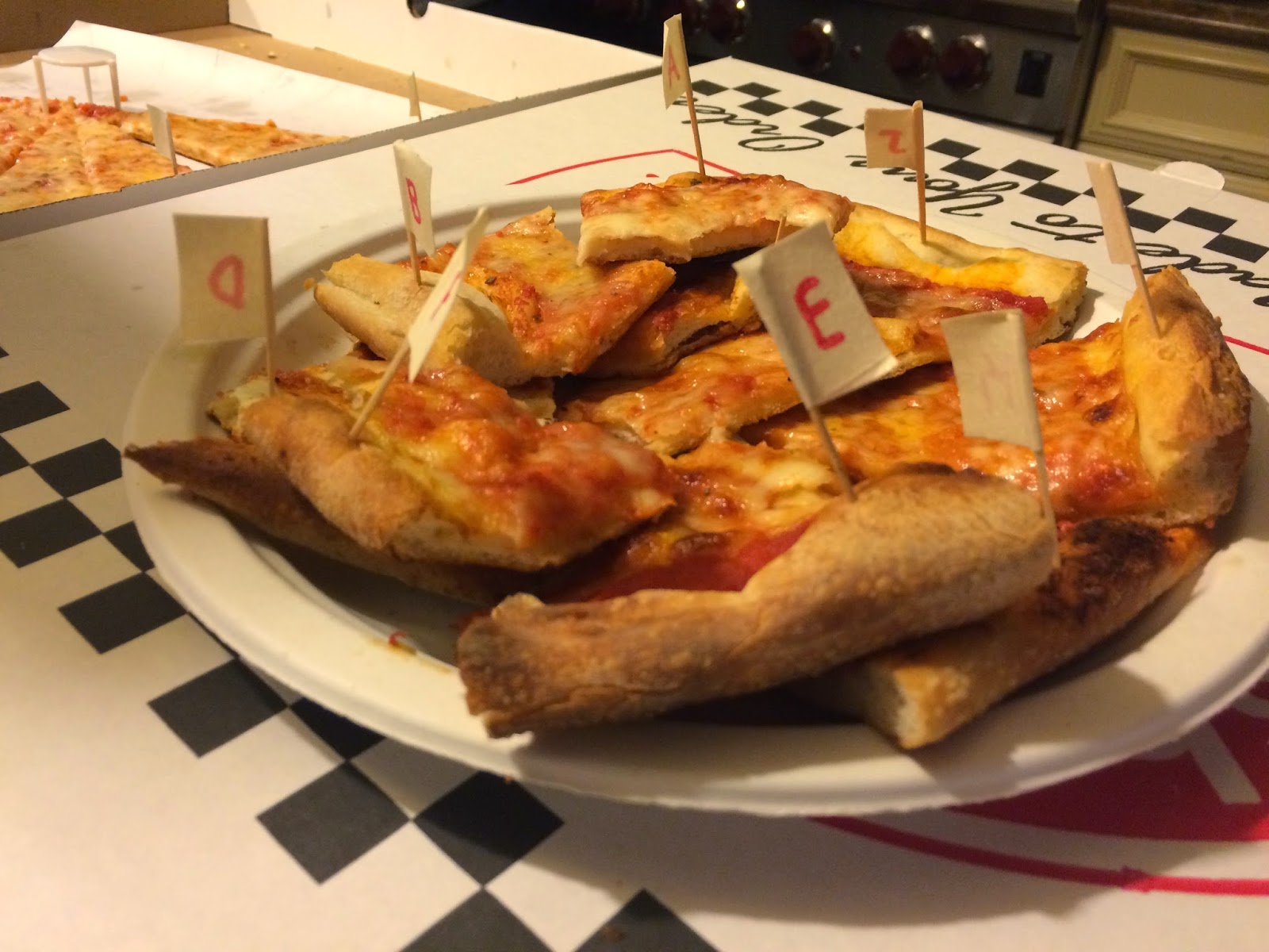 At time of delivery, pizzas were accepted and assigned a random alphabetical letter. Toothpicks with printed letters were then placed into each slice of each pie to prevent confusion of pizza slices once they were removed from the box. Names on the boxes (if visible) were quickly covered.